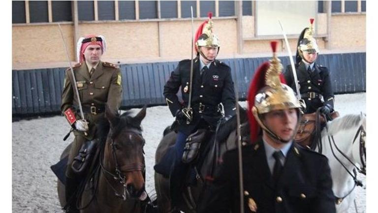 Two red and white “keffiyeh” mingle with the famous hand-made Cavalry helmets in an unusual spectacle. We are in Paris in the barracks of the French…